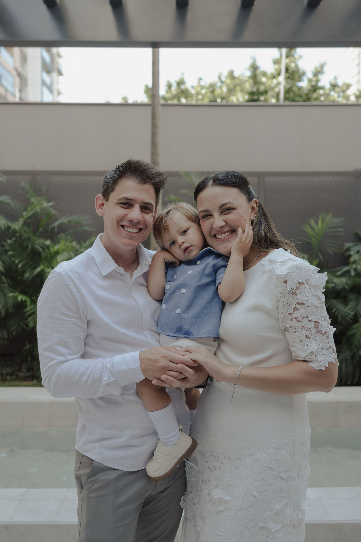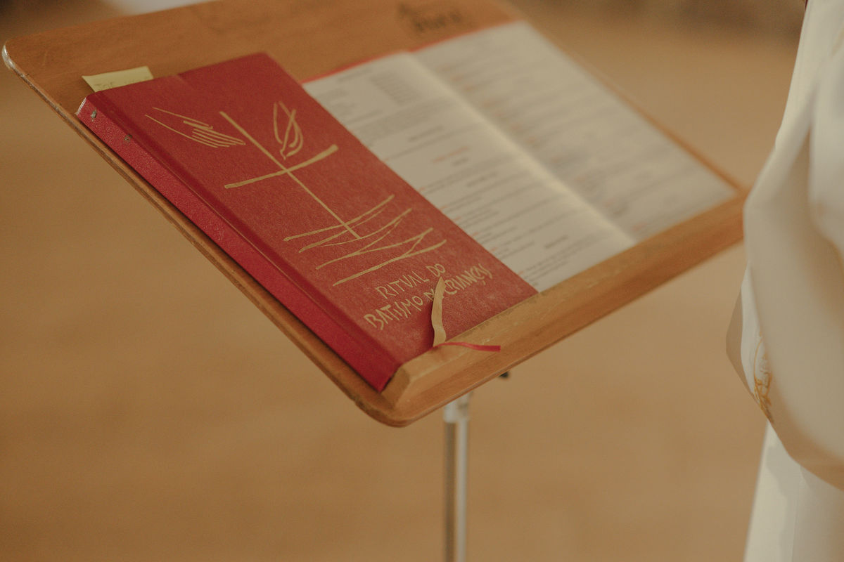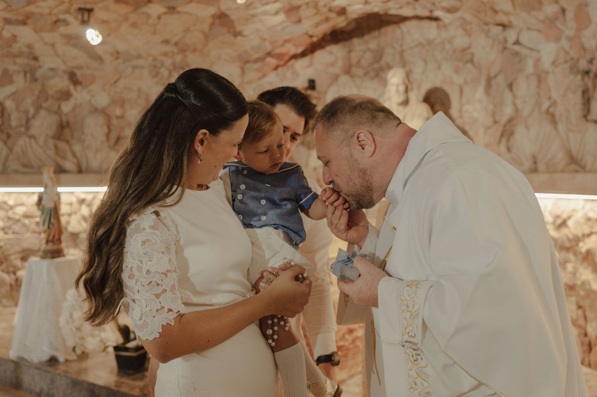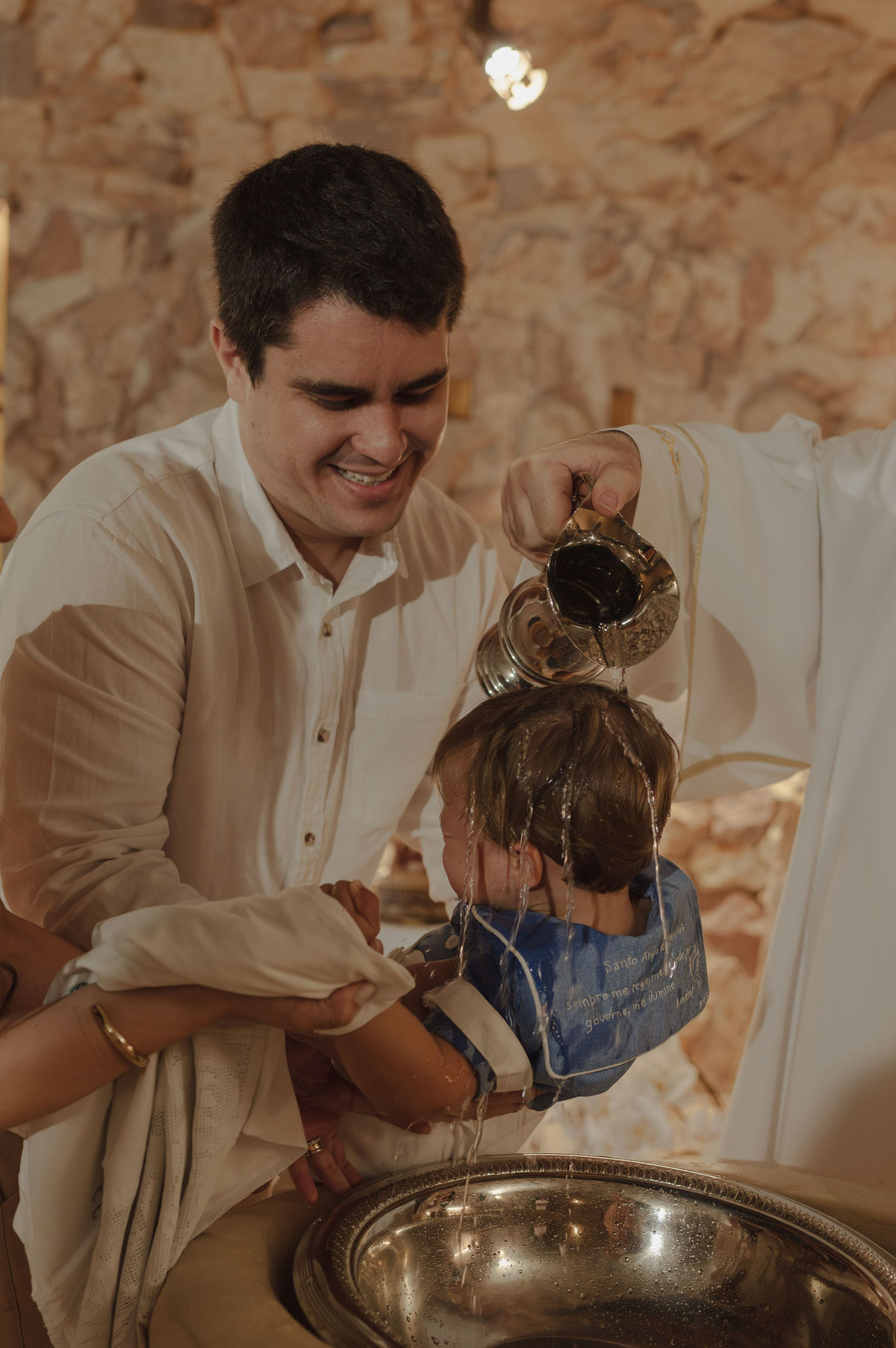 A fotografia documental revela não apenas o rito sagrado, mas a tensão doce e a esperança nos olhos dos pais e padrinhos, que o guiam neste primeiro passo espiritual. Um registro da proteção e do amor incondicional que o acolhe, prometendo sustentar sua jornada.